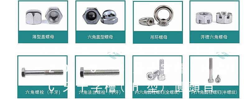螺栓有:1、方頭螺栓,2、半圓頭方頸螺栓,3、十字槽盤頭螺釘,4、內六角沉頭螺釘,5、方螺母C級,6、蝶形螺母,7、六角頭螺栓,8、十字槽盤頭自攻螺釘。大小有M18、M6、M8、M16、M10、M12、M14、M20等型號。通常用